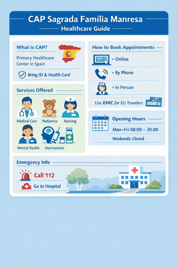 The CAP Sagrada Família Manresa is a primary healthcare facility. In Spain, these centers are known as CAP (Centro de Atención Primaria), meaning Primary Care Centers.